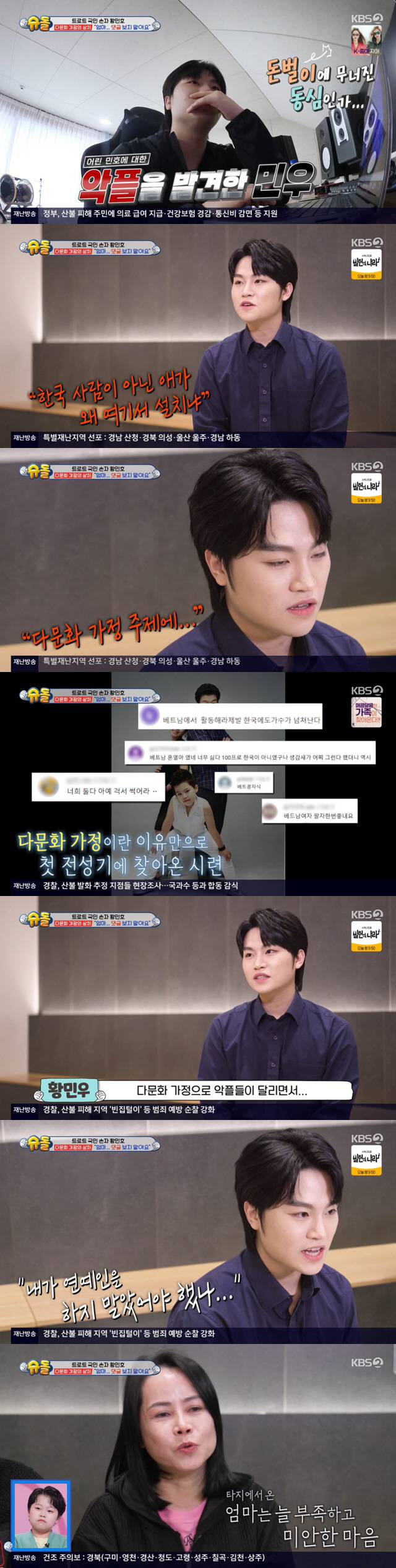 황민우는 "그때는 다문화 가정으로 악플들이 달리면서 '내가 연예인을 하지 말아야 했나'하는 생각이 들었다. 이런 연예인 직업을 선택하면서 엄마한테 안 좋은 댓글들이 달리니까 연예인을 선택한 걸 후회되는 순간이 많았다. 엄마도 속으로 많이 울지 않았을까 싶다. 엄마도 나도 버틴 것 같다"라며 눈물을 글썽거려 안타까움을 자아냈다.