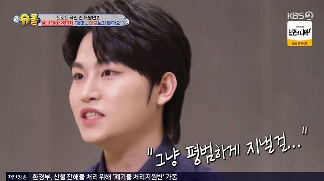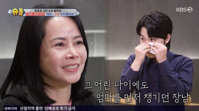 엄마는 "한국 엄마들은 아이 자기 전에 같이 이야기도 많이 하는데, 전 그런 적이 별로 없다. 너무 부족한 엄마 같다"라며 눈물을 보였고, 영상을 보던 황민호 역시 눈물을 참지 못했다. 엄마는 "제가 도와주는 것도 없는데, 항상 미안하다. 민우는 어렸을 때부터 어른스러웠다. 다른 사람들 얘기 듣지 말고, 댓글도 보지 말라고 했다. 우리 엄마 최고라고 말해줬다"며 어린 나이에도 엄마부터 신경 쓴 아들에게 고마운 마음을 전했다. 눈물을 보인 안영미는 "악플러들이 잘못된 건데 모작 왜 서로에게 미안해해야 하는지 모르겠다"고 분통을 터뜨렸다.