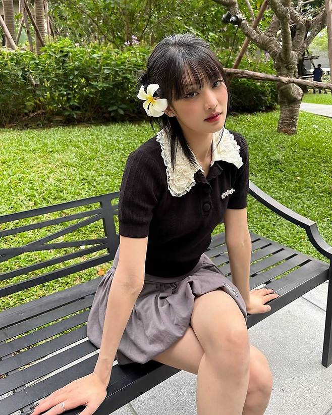 게시된 사진 속 그녀는 하얀색 레이스가 돋보이는 검은 반팔 티셔츠에 그레이 스커트를 매치해 입었으며 귀 뒤쪽에 하얀색 꽃을 꽂아 귀여운 분위기를 연출했다.