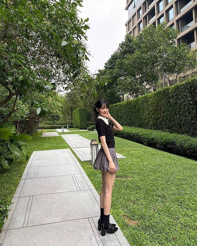 또다른 컷은 무성한 나무와 식물들로 뒤덮인 정원을 배경으로 찍은 전신 사진이다. 뒤로 보이는 푸르른 색의 정원과 민니만의 싱그러운 분위기가 잘 어우러져 한 편의 예술 작품 같은 사진이 탄생했다.