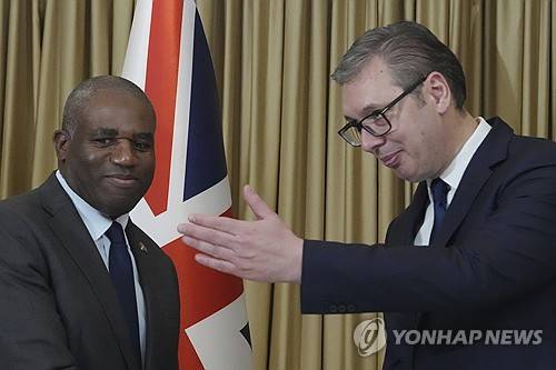 British Foreign Secretary David Lammy, left, shakes hands with Serbian President Aleksandar Vucic after a press conference, in Belgrade, Serbia, Wednesday, April 2, 2025. (AP Photo/Darko Vojinovic)