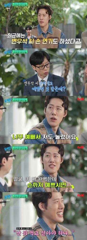 유재석은 "최근에 변우석 손 연기를 했다더라. 변우석 씨도 손이 길고 예쁜 걸로 안다"고 운을 뗐다.