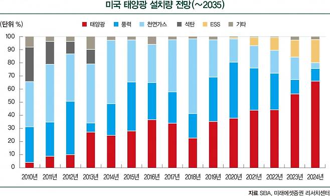 전망도 밝다. 미국 태양광발전 용량은 향후 5년간 연평균 4%씩 확대돼 2029년에는 현재 2배 수준인 440GW에 달할 것으로 전망된다. 미국 에너지정보청(EIA)의 단기 에너지 전망(STEO)에 따르면, 미국 에너지믹스에서의 태양광발전 비중은 2023년 4%에서 2024년 5%, 2025년 7%로 견조한 성장을 지속할 것이며, 2025년에는 미국에서 태양광발전 용량이 석탄 화력발전 용량에 근접할 것으로 예상된다.