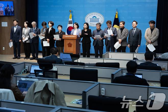(서울=뉴스1) 이재명 기자 = 더불어민주당 기후위기행동의원 모임 '비상' 소속 의원들이 3일 오전 서울 여의도 국회 소통관에서 산불 등 기후 재난 대응 촉구 기자회견을 하고 있다. 2025.4.3/뉴스1