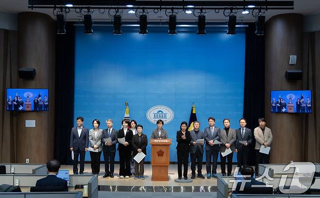 (서울=뉴스1) 이재명 기자 = 더불어민주당 기후위기행동의원 모임 '비상' 소속 의원들이 3일 오전 서울 여의도 국회 소통관에서 산불 등 기후 재난 대응 촉구 기자회견을 하고 있다. 2025.4.3/뉴스1