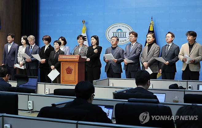 (서울=연합뉴스) 김주성 기자 = 더불어민주당 임미애 의원 등 기후행동의원모임 '비상' 참여 의원들이 3일 서울 여의도 국회 소통관에서 산불 등 기후재난 대응을 촉구하는 기자회견을 하고 있다. 2025.4.3