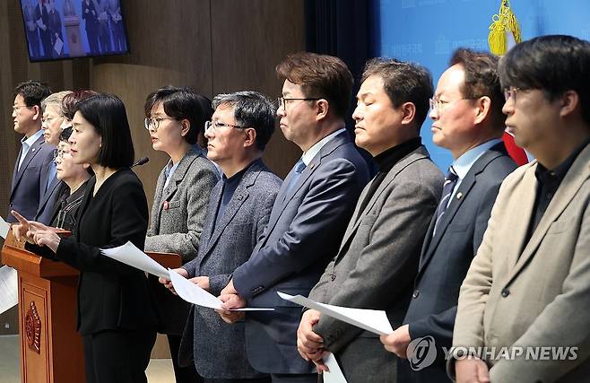 (서울=연합뉴스) 김주성 기자 = 더불어민주당 임미애 의원 등 기후행동의원모임 '비상' 참여 의원들이 3일 서울 여의도 국회 소통관에서 산불 등 기후재난 대응을 촉구하는 기자회견을 하고 있다. 2025.4.3