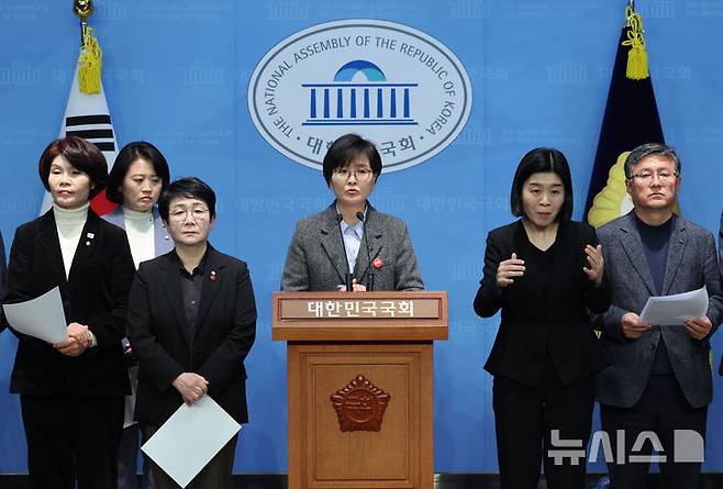 [서울=뉴시스] 권창회 기자 = 임미애 더불어민주당 의원을 비롯한 기후행동의원모임 '비상' 소속 의원들이 3일 오전 서울 여의도 국회 소통관에서 열린 산불 등 기후재난 대응 촉구 기자회견에서 발언하고 있다. 2025.04.03. kch0523@newsis.com
