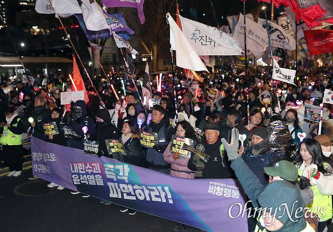 | ▲ 헌재 앞 경찰 차벽에 막힌 시민들 29일 오후 서울 광화문 동십자각 앞에서 열린 윤석열 즉각 퇴진! 사회대개혁! 17차 범시민대행진 참가자들이 헌법재판소의 윤석열 탄핵 선고 지연에 분노를 표하며 헌법재판소를 향해 행진하다 경찰 차벽에 막혀 있다. |