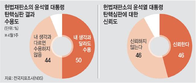 엠브레인퍼블릭·케이스탯리서치·코리아리서치·한국리서치가 지난달 31일∼2일 만 18세 이상 1001명을 대상으로 진행한 4월 1주 NBS(전화면접조사)에서 ‘헌재 심판을 신뢰한다’는 응답과 ‘신뢰하지 않는다’는 응답은 모두 46%를 기록했다. 지난 3월 4주 조사와 비교해 ‘신뢰한다’는 응답은 7%포인트 떨어졌고, ‘신뢰하지 않는다’는 6%포인트 상승했다.