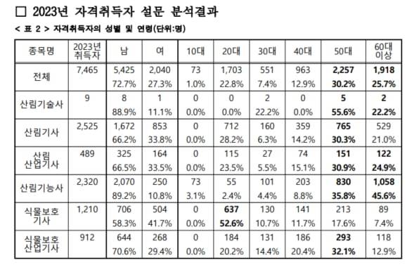이를 바탕으로 공단은 산림 및 식물보호 분야 자격은 50대 이상의 재직 중인 근로자가 퇴직 후 재취업을 목적으로 많이 취득하는 것으로 분석했다.