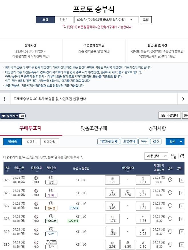 국민체육진흥공단이 발행하는 체육진흥투표권 스포츠토토의 수탁사업자 스포츠토토코리아가 오는 4월 3일 오후 6시 30분에 수원 KT위즈파크에서 열리는 2025 KBO리그 KT위즈(홈)-LG트윈스(원정)전을 대상으로 한 프로토 승부식 40회차의 '야구 전반 유형'이 발매 마감을 앞두고 있다고 3일 밝혔다.