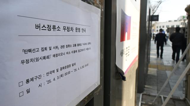 윤석열 대통령에 대한 헌법재판소의 탄핵 심판 선고일을 하루 앞둔 3일 서울 종로구 헌법재판소 인근 버스정류장에 무정차 안내문이 붙어있다. 서울시는 선고 당일인 4일 지하철 3호선 안국역의 모든 출입구를 폐쇄하고 무정차 통과시키며 광화문역과 경복궁역 등은 실시간 혼잡도에 따라 탄력 운영할 예정이다. 광화문교차로, 세종대로 사거리, 안국역, 여의대로, 한남동 등 주요 집회 구간을 경유하는 시내버스는 무정차 또는 임시우회한다. 오승현 기자 2025.04.03