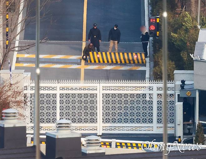 | ▲ 내란 우두머리 혐의로 구속된 윤석열 대통령에 대한 법원의 구속 취소 결정이 지난 3월 7일 오후 서울 용산구 한남동 대통령 관저 정문에서 경호직원들이 차량저지용 바리케이드를 점검하고 있다. |