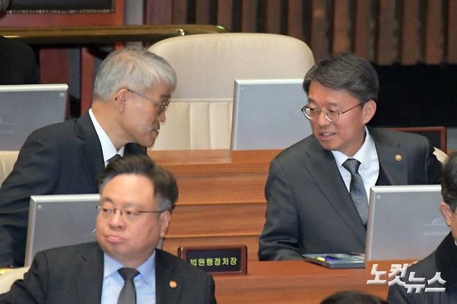 3일 서울 여의도 국회에서 열린 제423회국회(임시회) 제4차 본회의 경북·경남·울산지역 산불 사태 수습과 피해대책 마련 및 헌법질서 수호를 위한 긴급현안질문에서 천대엽 법원행정처장(왼쪽)과 김정원 헌법재판소 사무처장이 대화를 하고 있다.