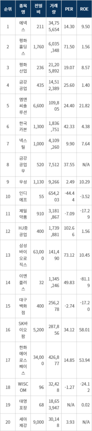 에넥스는 전 거래일 대비 211원 상승하며 거래량 34,755,654주를 기록했다. PER은 14.30, ROE는 9.50이었다. 평화홀딩스의 거래량은 6,035,348주였으며, PER은 71.50, ROE는 1.56으로 나타났다. 평화산업은 거래량 21,205,892주, PER 19.07, ROE 8.57을 기록했다. 금강공업은 거래량 14,512,389주, PER 25.60, ROE 1.40을 보였다. 엠앤씨솔루션의 거래량은 109,805주, PER은 24.40, ROE는 21.82이었다.