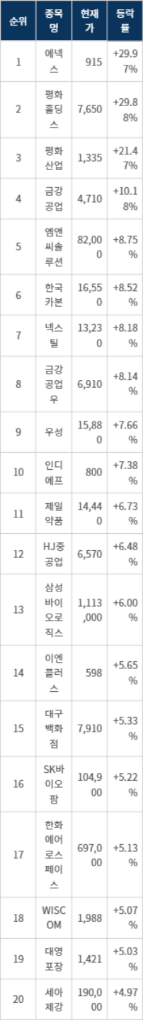 [서울데이터랩]에넥스, 29.97% 등락률로 증시 1위 달성