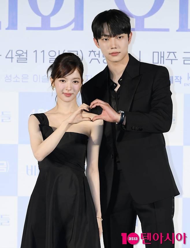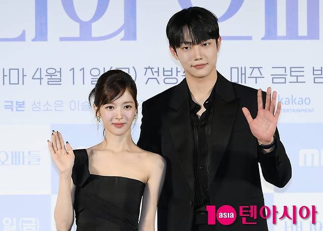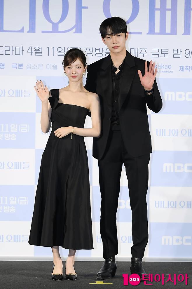 배우 노정의와 조준영이 3일 서울 용산구 CGV 용산아이파크몰에서 열린 MBC 새 금토드라마 <바니와 오빠들> 제작발표회에 참석해 포즈를 취하고 있다. 바니와>