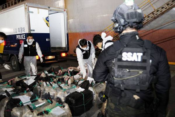 동해지방해양경찰청과 관세청 관계자들이 지난 2일 강원도 강릉 옥계항에 정박한 외국 선박에서 코카인으로 추정되는 마약을 적발해 이를 옮기고 있다. 이번에 적발된 마약은 중량 2t, 시가 1조원 상당으로 6700만명이 동시에 투약할 수 있는 규모다. 연합뉴스