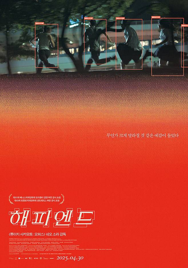 '해피엔드'는 지진의 위협이 상존하는 근미래 도쿄를 배경으로, 친구 유타와 코우가 관계의 균열을 마주하며 성장하는 과정을 그린 청춘 드라마다. '류이치 사카모토: 오퍼스'를 연출한 네오 소라 감독의 장편 데뷔작으로 지난해 제81회 베니스국제영화제와 제49회 토론토국제영화제에 공식 초청되어 주목을 받기도 했다. 대형 상업 영화들을 제치고 왓챠 개봉 예정작 인지 선호도 조사에서 4월 첫째 주 1위를 차지하는 등 입소문을 이어가고 있는 작품이다.