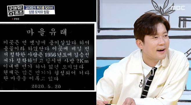 실제로 마을에 세워진 비석에는 '마을 유래. 이곳은 먼 옛날에 용이 살았다 하여 용골이라 하였단다. 이곳에 제일 먼저 정착한 사람은 1956년도에 김승선 씨가 정착하였고 당시엔 사방 2km 이내엔 민가 하나 없던 오지였다. 현재는 많은 민가가 형성되어 커다란 마을을 이루고 있다'고 적혀 있었다. '김승선'이 김대호의 할아버지라고.