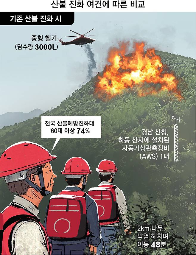 산불 방향을 특정하기 위해서는 기상 관측도 중요하다. 동아일보가 역대 최장 시간을 기록한 경남 산청 산불 지역(산청, 하동군)을 살펴본 결과 기상청 자동기상관측장비(AWS) 총 8개가 설치돼 있었다. 이 중 산지에 설치된 것은 1개(지리산 872지점)에 불과했다. 사실상 화재 지역의 정확한 풍향과 풍량을 확인하는 게 불가능했던 셈이다. 산림청 관계자는 “AWS 시설을 늘리거나 산불진화차량에 이동식 관측 장비를 달면 기상 관측 정확도를 높일 수 있다”며 “산불을 키우는 바람의 속도, 방향 등을 정확히 예측해 산불 진화를 정교화하는 것”이라고 설명했다.