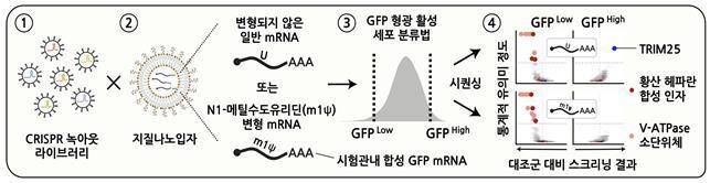 이에 연구팀은 외부 mRNA를 제어하는 세포 내 인자를 찾기 위해 크리스퍼(CRISPR) 유전자가위를 이용한 '녹아웃 스크리닝'을 진행했습니다.