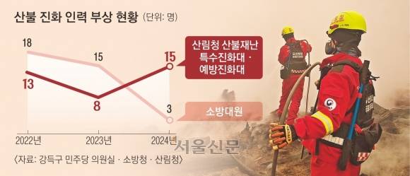 이날 서울신문이 강득구 더불어민주당 의원실을 통해 받은 자료를 보면 2022~2024년 부상자(72명) 중 소방대원은 ▲2022년 18명 ▲2023년 15명 ▲2024년 3명, 특수진화대·예방진화대는 ▲2022년 13명 ▲2023년 8명 ▲2024년 15명으로 집계됐다.