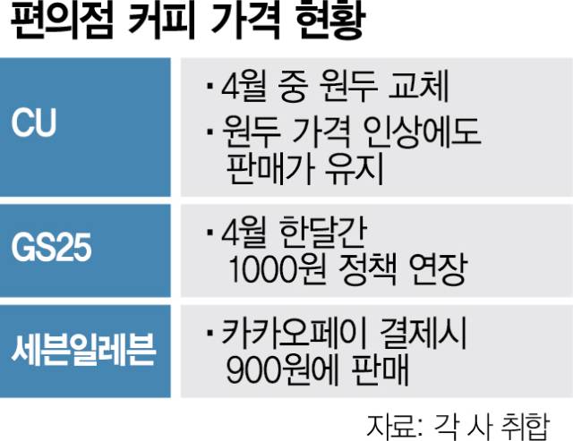 다른 편의점들은 기존 커피 가격에서 더 내린 할인 행사를 펼치고 있다. GS25는 지난달에 이어 이달에도 ‘카페25’의 핫 아메리카노를 기존 1300원에서 1000원으로 할인 판매한다. 세븐일레븐 역시 4월 한달간 오전 7시부터 11시까지 카카오페이머니 결제 시 ‘세븐카페 ICE 레귤러’를 50% 할인해 900원에 구매할 수 있는 프로모션을 운영한다. SK텔레콤 멤버십 할인과 모바일앱 ‘세븐앱’ 구독권 할인까지 중복 적용하면 커피 가격은 580원까지 내려간다.