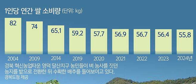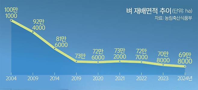 3일 농림축산식품부에 따르면 최근 쌀 소비는 줄고 있으나 벼 재배면적은 여전히 과잉 상태다. 1인당 쌀 소비량은 2019년 59.2㎏에서 2024년 55.8㎏으로 감소했다. 같은 기간 벼 재배면적은 73만㏊에서 69만8000㏊로 고작 4.4%만 줄었다. 그 결과 매년 20만t 이상이 초과 생산되고, 정부는 4년 연속 시장격리를 통해 총 120만t의 쌀을 매입하는 데 2조6000억원을 투입했다.