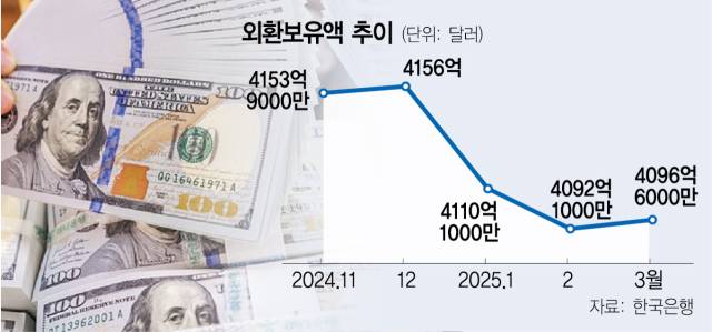 지난달 우리나라 외환보유액이 석 달 만에 반등했지만 여전히 4100억 달러 선을 아래를 밑돌았다. 분기 말 금융사의 달러 예수금 증가 효과가 소멸할 경우, 외환보유고 4000억 달러 수성도 장담할 수 없다는 관측이 나온다.