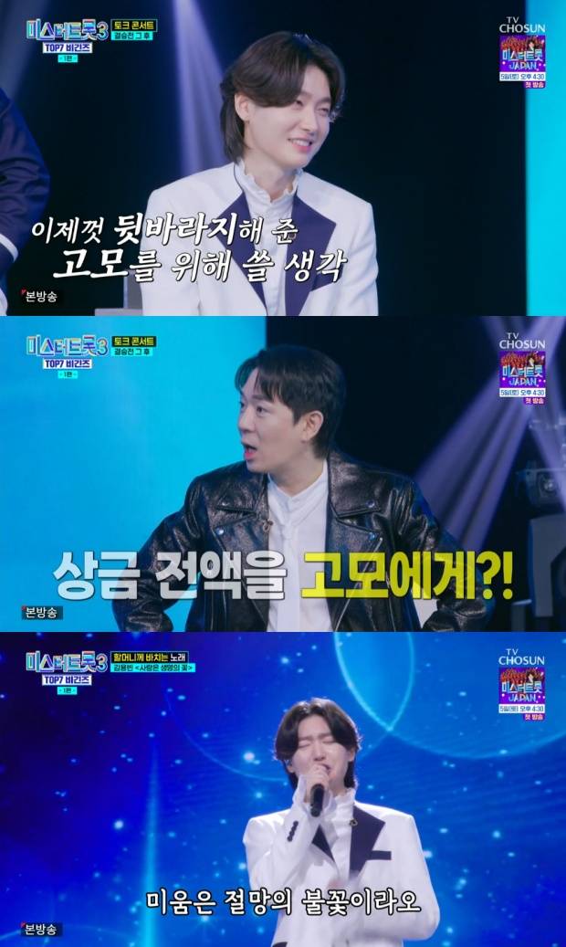 이날 방송에서는 '미스터트롯3' 영광의 진(眞)에 오른 김용빈의 과거사가 조명됐다. 어린시절 부모님의 이혼으로 할머니 손에 자란 그는 "할머니가 엄마이자 친구였다. 할머니가 해주시는 거에 비해 엄청 성공해서 돈을 번 것도 아니라 공황장애도 오고 우을증도 왔다. 그래서 7년동안 활동을 하지 않았다"고 밝혔다.