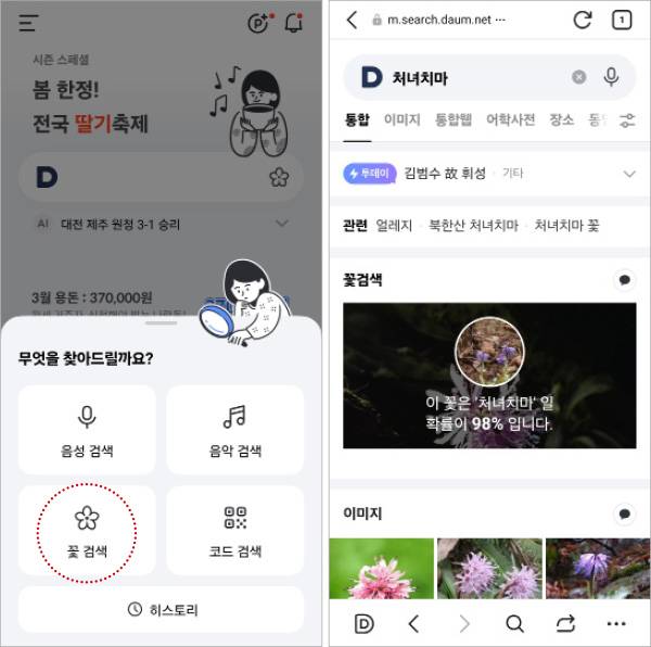 국내 양대 포털사이트 중 하나인 '다음'은 앱을 통해 꽃 검색 서비스를 제공하고 있다. 가장 대중적이며 사용법도 매우 간단하다. 다음 앱의 검색창 오른쪽에 붙어 있는 꽃 모양의 아이콘을 클릭한 뒤 꽃 검색을 클릭하면 바로 카메라로 연결된다.