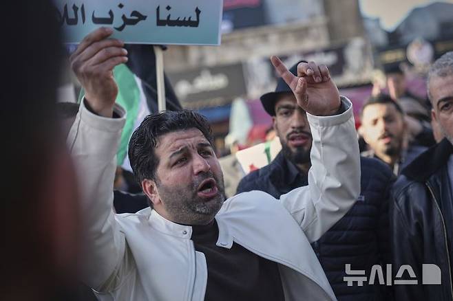 [이드리브=AP/뉴시스] 3일(현지 시간) 시리아 이드리브에서 열린 반이스라엘 시위에 참가한 한 남성이 손팻말을 들고 구호를 외치고 있다. 2025.04.04.