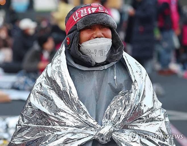 (서울=연합뉴스) 김도훈 기자 = 윤석열 대통령 탄핵심판일인 4일 오전 서울 종로구 안국역 인근에서 '윤석열 8대0 파면을 위한 끝장 대회' 참가자가 방한용 은박 비닐을 덮은 채 활짝 웃고 있다. 2025.4.4