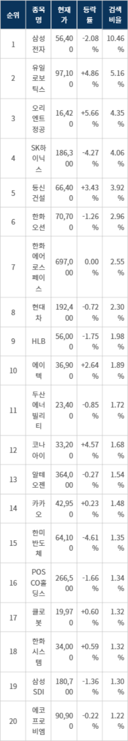 이어 유일로보틱스(388720)가 검색비율 2위를 기록하며 4.86%의 상승세를 기록하고 있다. 검색비율 3위의 오리엔트정공(065500)은 5.66% 상승하며 순조롭게 출발하는 모습이다. 검색비율 4위 SK하이닉스(000660)는 개장 초반부터 4.27%의 하락률을 보이며 하락세를 보이고 있다. 검색비율 5위 동신건설(025950)은 3.43% 상승하며 주가가 오르고 있다.