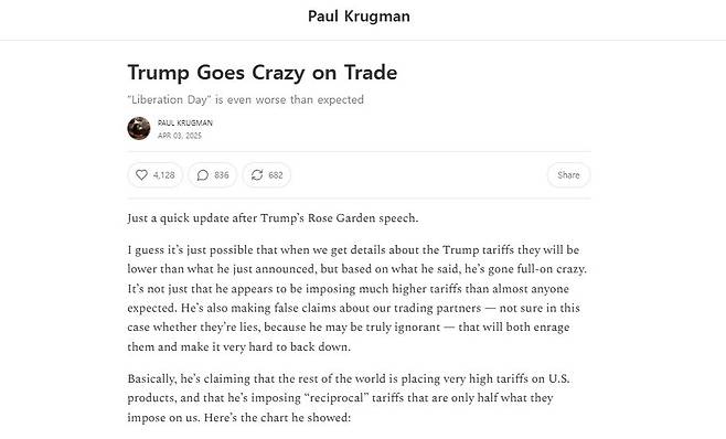 크루그먼 교수는 이 글에서 "(트럼프는) 거의 모두가 예상했던 것보다 훨씬 더 높은 관세를 부과하는 것처럼 보인다는 것만이 아니"라며 "무역 파트너들에 대해 거짓 주장을 펴고 있다"고 말했다.