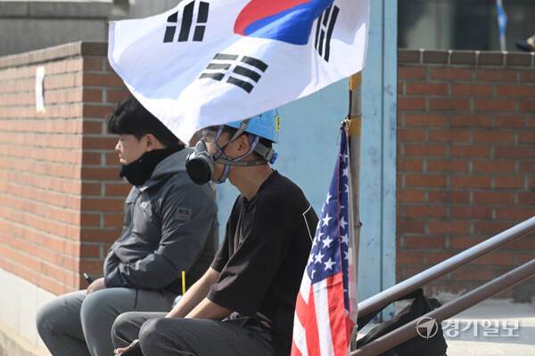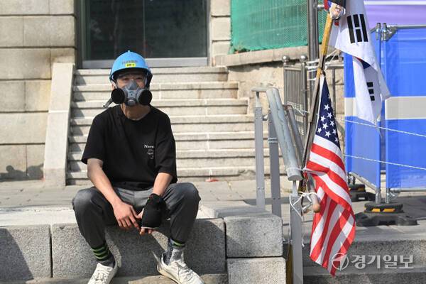 헌법재판소의 윤석열 대통령 탄핵심판 선고일인 4일, 서울 안국역 인근 거리에서 한 시민이 방독면을 착용한 채 앉아 있다.
