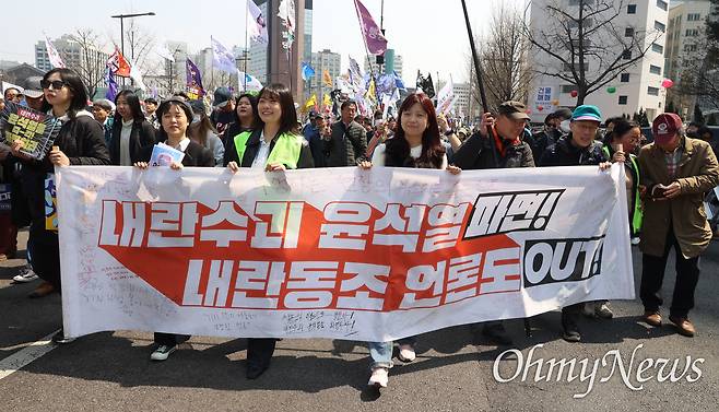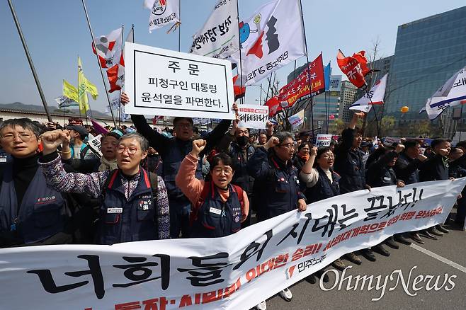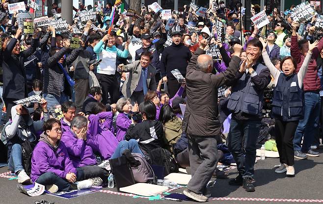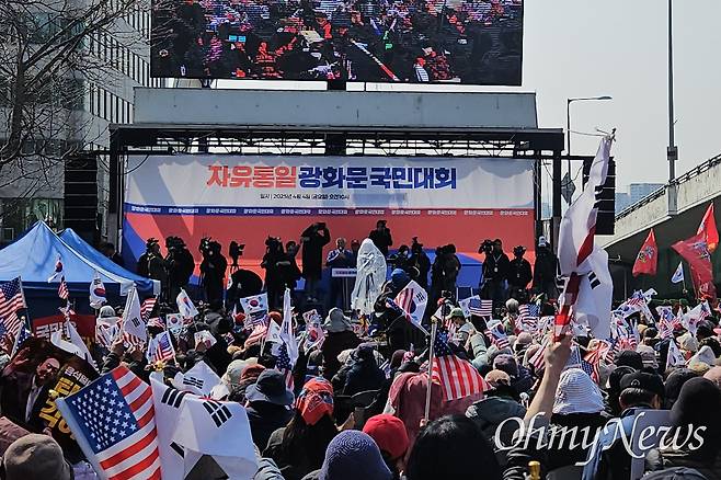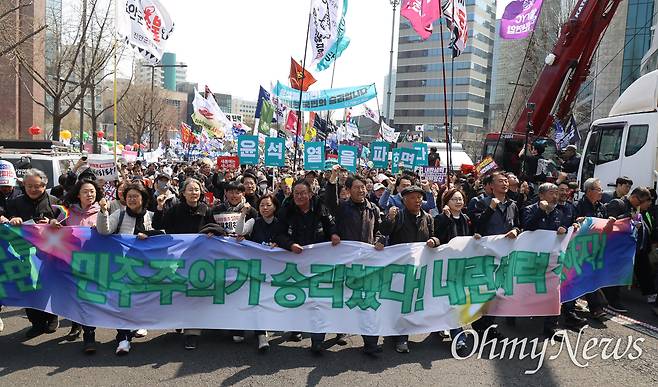봄바람에 나부끼는 깃발과 함께 4일 낮 12시 20분께 정부서울청사 앞으로 집결한 이들은 "대한민국은 민주공화국"이라고 목소리를 높였다. "(마은혁 헌법재판관 후보자 미임명 등으로) 국민을 배반한 한덕수 국무총리(대통령 권한대행)가 있는 청사를 향해 함성을 질러달라"는 사회자의 말에 10초간 함성을 지르기도 했다. 점심시간을 맞아 거리로 나온 직장인·공무원·관광객들은 청사 앞 대로를 가득 메운 인파에 놀란 듯 카메라로 이들을 연신 촬영했다.