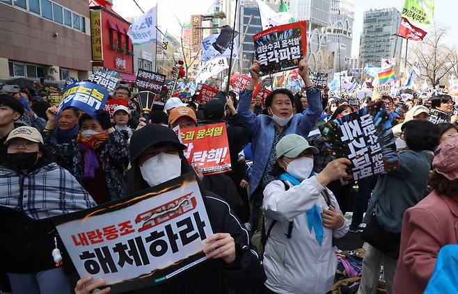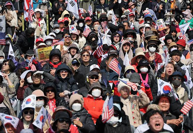 윤석열 파면에 극우세력은 욕설과 폭동 선동의 말을 내뱉었다. 취재진을 향해 "뭘 찍어, 이 XXX들아"라고 소리치며 태극기를 든 손을 휘둘렀다. 생중계 화면을 찍던 한 젊은 남성은 얼굴이 빨개지도록 울기도 했다. '순국결사대'라고 적힌 조끼를 입고 빨간 모자를 쓴 노년 남성들은 전광훈 목사가 있는 연단을 향해 소리를 치고 손가락질했다.