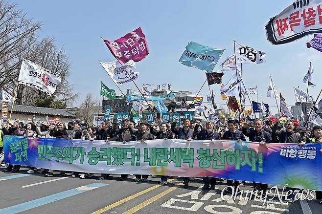 | ▲ 윤석열즉각퇴진·사회대개혁 비상행동이 4일 오전 윤석열 파면 선고 직후 헌법재판소가 있는 안국역에서 광화문 쪽으로 이동하고 있다. |