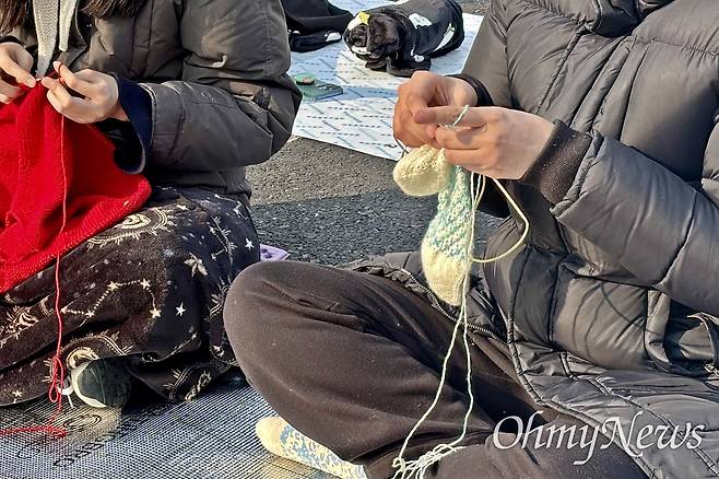 | ▲ 윤석열의 파면을 촉구하며 탄핵심판 선고 전날부터 헌법재판소 인근 안국역에서 밤을 지새운 시민들이 4일 오전 뜨개질을 하며 아침을 맞고 있다. |