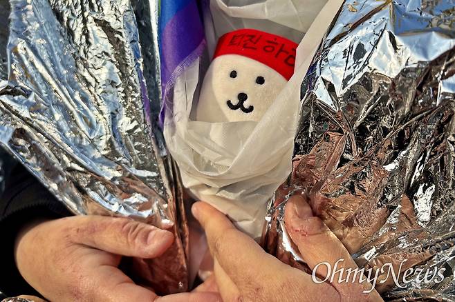 | ▲ 윤석열의 파면을 촉구하며 탄핵심판 선고 전날부터 헌법재판소 인근 안국역에서 밤을 지새운 한 시민이 4일 오전 가슴에 "퇴진하라"가 적힌 머리띠를 한 인형을 가슴에 품고 있다. |