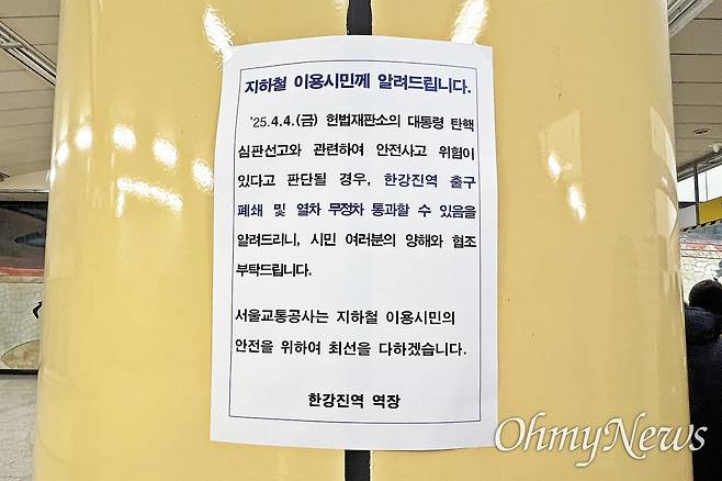 | ▲ 윤석열 탄핵심판 선고일인 4일 오전, 한남동 관저 인근의 한강진역에 출구 폐쇄 및 열차 무정차 통과 가능성을 안내하는 게시물이 붙어 있다. |
