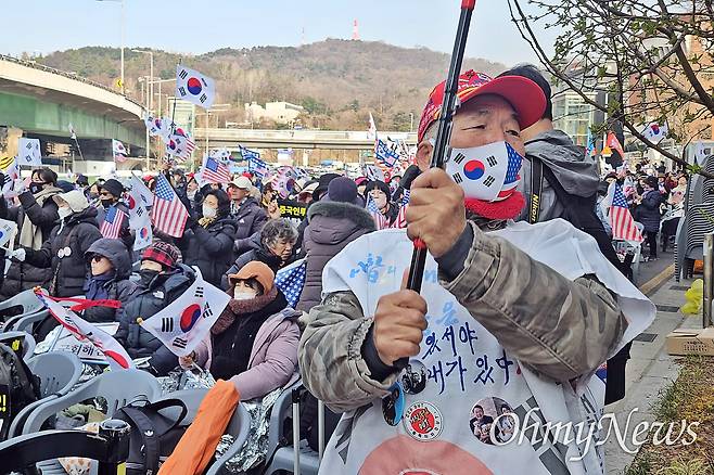 | ▲ 내란 우두머리 혐의 윤석열의 지지자가 헌법재판소 탄핵심판 선고일인 4일 오전 한남동 관저 인근 집회에 참석해 있다. |