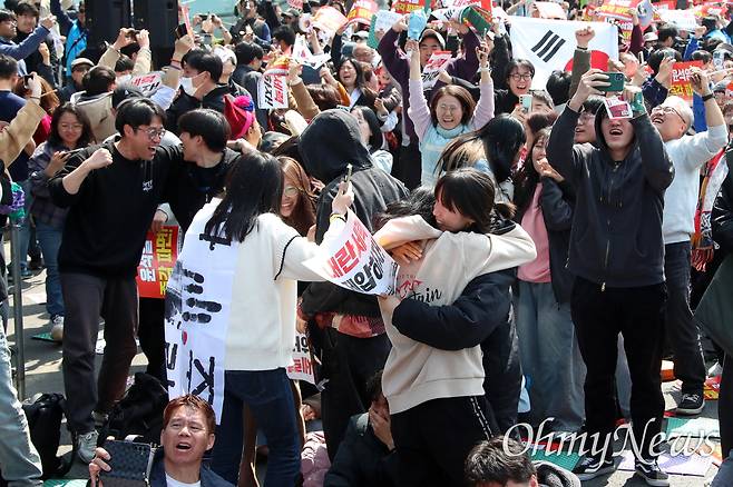 | ▲ 4일 오전 서울 종로구 헌법재판소 인근 안국역 앞에 모인 시민들이 헌법재판소가 윤석열 대통령에 대한 탄핵심판 선고에서 파면을 결정되자 기뻐하고 있다. |