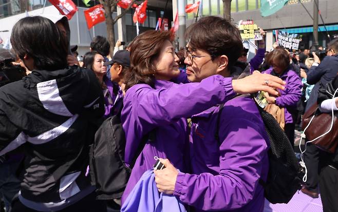| ▲ 4일 오전 서울 종로구 헌법재판소 인근 안국역 앞에서 이태원참사 유가족들이 헌법재판소가 윤석열 대통령에 대한 탄핵심판 선고에서 파면을 결정되자 기뻐하고 있다. |