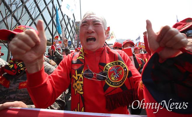 | ▲ 윤석열 대통령 파면, 기뼈하는 해병대 예비역 연대 해병대 예비역 연대 소속 예비역 해병대들이 4일 오전 서울 용산구 대통령관저 인근에서 열린 촛불행동 주최 '윤석열 파면 선고 생중계'에 참석, 윤석열 대통령 파면 선고를 지켜본 뒤 기뻐하고 있다. |