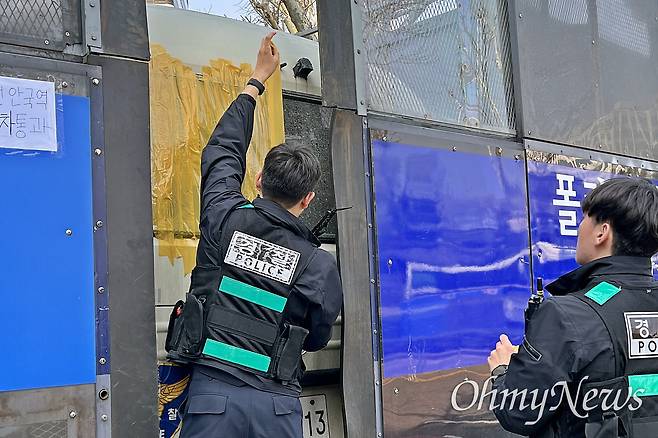 | ▲ 경찰이 4일 오후 윤석열 파면 직후 극우세력이 파손한 경찰버스의 깨진 유리창을 테이프를 이용해 임시로 보수하고 있다. |