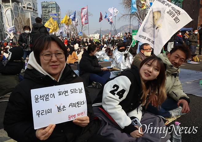 행진 대열은 이내 축제의 장이 됐다. 행진 주최 측이 튼 노래에 맞춰 일면식도 없는 이들은 서로 어깨를 잡고 뛰어노는가 하면, 춤을 추고 노래를 따라 불렀다. 도로 한복판에 벌어진 갑작스러운 춤판에 남녀노소 모두 동참했다. <오마이뉴스>와 만난 진아무개(20대 여성)씨는 "윤석열 파면 소리를 들은 뒤 없어진 식욕이 돌아왔다"며 "광화문에서 제일 맛있는 점심을 먹을 계획"이라고 웃었다.